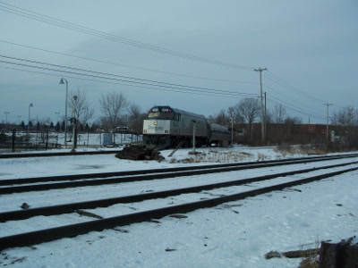 AMTK 90214 awaits a meet at Saco on the 17th of March, 2003. AMTK 122 is on the rear.