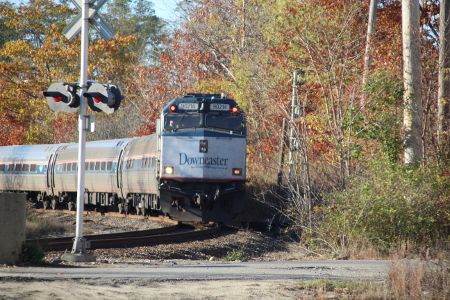 Amtrak 31 flies past Yarmouth Junction with 90214 and 691 toward Freeport.