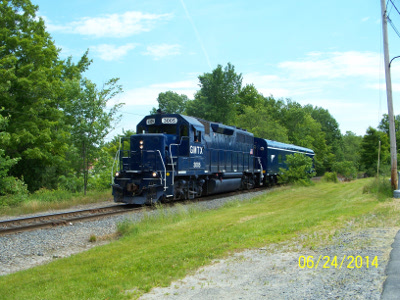 GMTX 3005 with one OCS passenger car at Packard in Readfield on June 24th of 2014.