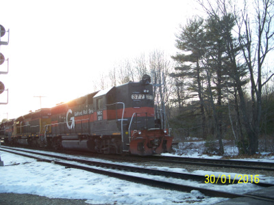 GMTX 3733, GATX 3702, & SLR 3000 meet MEC 380 at Danville ME in February of 2000.