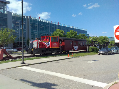 MNGR 5 picking up passengers at Ocean Gate in Portland on August 6th of 2023. This engine has been on loan from Edaville for a time.