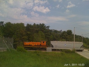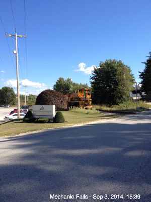 SLR 1502 & 1504 with train 513 switching Auburn Manufacturing in Mechanic Falls on September 3rd of 2014.